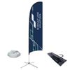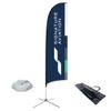 Draw attention to your business, promotion, or location with this feather flag! Measuring 12', this flag is made of 110g knitted polyester and is reinforced with fiberglass pole pockets to create a stylish black outline around the edge. Features include strong and flexible fiberglass poles, polished aluminum collar pole segment ends, ground stake, an ergonomic cross base that is great for use on hard, flat surfaces, both indoors and outdoors, and a waterbag for added sturdiness. Your full color artwork will be displayed on both sides using dye sublimation printing. Each flag comes with a 600 denier polyester carry case and 100% epoxy fiberglass hardware with a lifetime warranty. A great choice for special events and more!