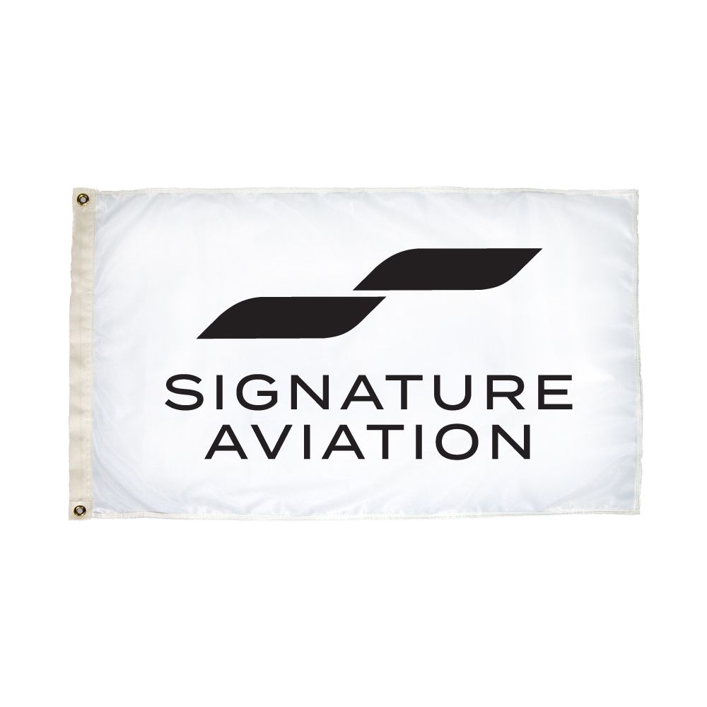 Direct print 3.8 oz. polyester flag sewn with header, grommets and sleeves. Signature logo in black, reads reverse on backside.